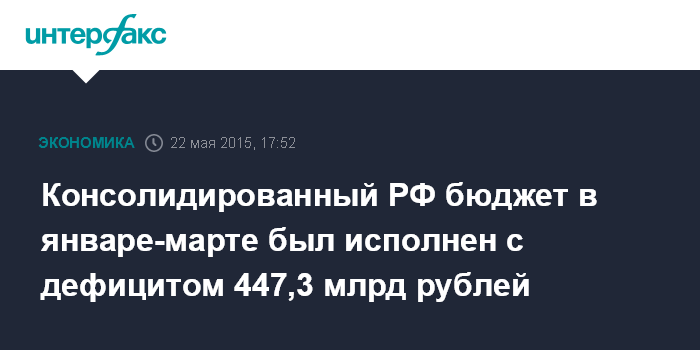 Москва. 22 мая. INTERFAX.RU - Консолидированный бюджет РФ в январе-марте 2015 года исполнен с дефицитом 447,3 млрд рублей, сообщается в материалах, опубликованных на сайте Федерального казначейства.