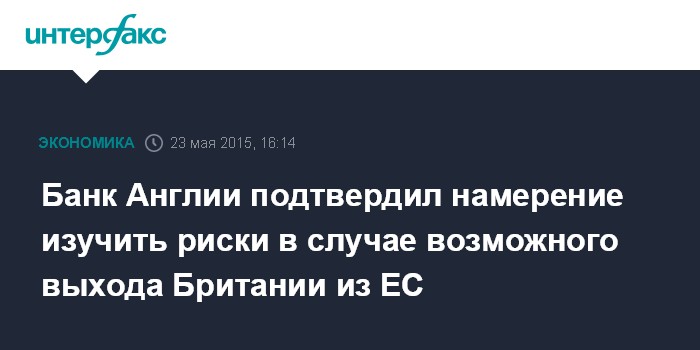Москва. 23 мая. INTERFAX.RU - Банк Англии планирует провести оценку рисков в случае возможного выхода Великобритании из состава Евросоюза, говорится в заявлении центрального финансового института страны.