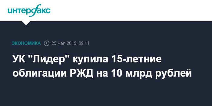 УК "Лидер" купила 15-летние облигации РЖД на 10 млрд рублей