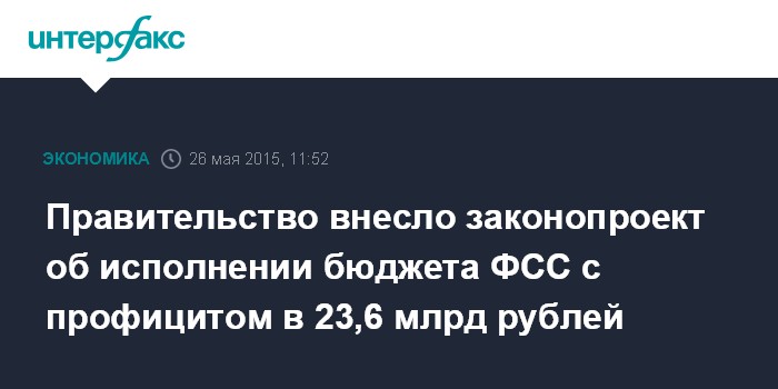 Москва. 26 мая. INTERFAX.RU - Правительство РФ внесло в Госдуму законопроект об исполнении бюджета Фонда социального страхования РФ (ФСС) за 2014 год с профицитом в объеме 23,6 млрд рублей.