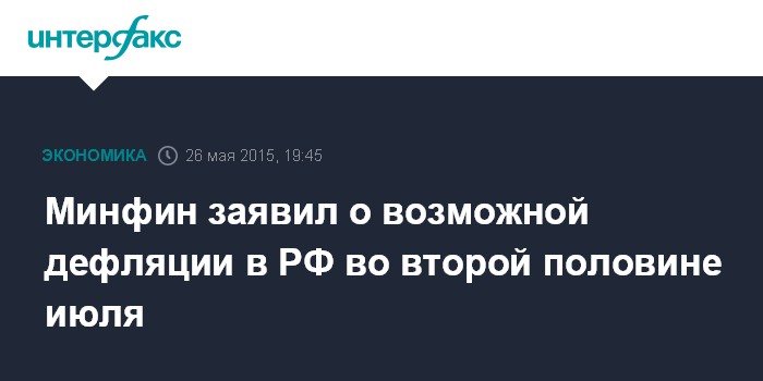 Москва. 26 мая. INTERFAX.RU - Дефляция в России может начаться уже во второй половине июля и продолжится до сентября, при этом снижение цен может быть более значительным, чем в предыдущие годы, когда в августе фиксировалось дефляция, заявил "Интерфаксу" директор департамента долгосрочного стратегического планирования Минфина Владимир Колычев.