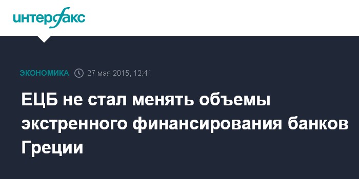 Москва. 27 мая. INTERFAX.RU – Европейский центральный банк не стал менять предельный объем финансирования греческих банков в рамках программы экстренного предоставления ликвидности (Emergency Liquidity Assistance, ELA), оставив его на уровне 80,2 млрд евро, сообщает агентство Bloomberg со ссылкой на информированные источники.