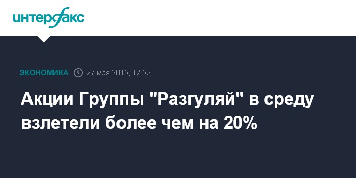 Москва. 27 мая. INTERFAX.RU – Акции Группы "Разгуляй" в среду ускорили рост в отсутствие новостей, бумаги взлетели более чем на 20%.