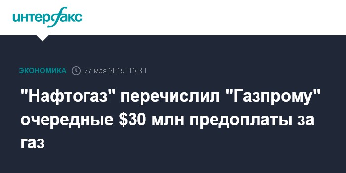 Москва. 27 мая. INTERFAX.RU – "Нафтогаз Украины" 26 мая перечислил "Газпрому" еще $30 млн в виде предоплаты за поставки российского газа, сообщили "Интерфаксу" в пресс-службе украинского госхолдинга в среду.