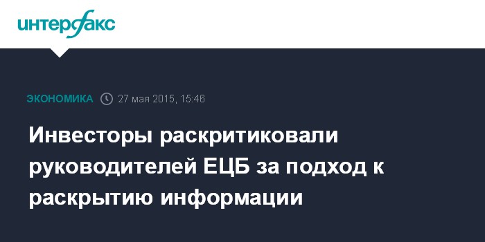 Москва. 27 мая. INTERFAX.RU – Инвесторы выражают озабоченность тем, как руководители Европейского центрального банка раскрывают информацию на закрытых встречах с участниками рынка, поскольку тем самым регуляторы дают преимущество одним инвесторам перед другими, пишет The Wall Street Journal.