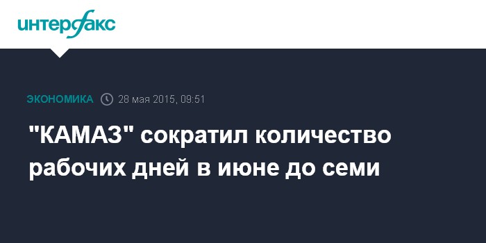 Москва. 28 мая. INTERFAX.RU – "КАМАЗ" внес изменения в июньский график работы в связи продолжающимся падением рынка грузовой техники, говорится в корпоративной газете предприятия. Принятый ранее график работы в июне предполагал 12 рабочих дней, теперь речь идет о семи рабочих днях.