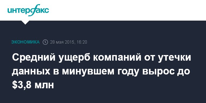 Москва. 28 мая. INTERFAX.RU – Средний убыток крупных мировых компаний в связи с утечкой данных в 2014 году вырос на 23% и составил $3,8 млн, по данным совместного исследования Ponemon Institute и компании IBM.