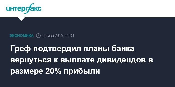 Москва. 29 мая. INTERFAX.RU – Глава Сбербанка Герман Греф на годовом собрании акционеров подтвердил планы банка вернуться по итогам 2015 года к старой дивидендной практике - выплате дивидендов в размере 20% от чистой прибыли по МСФО.