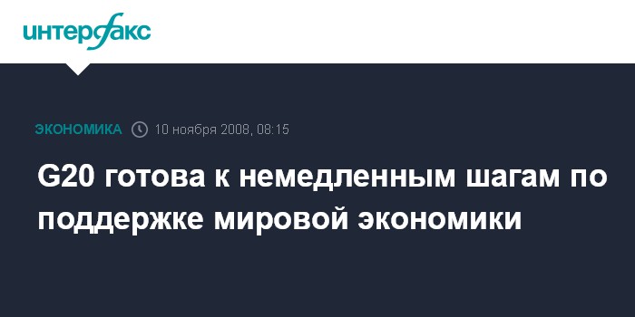 Москва. 10 ноября. INTERFAX.RU - Министры финансов и главы центральных банков G20 заявили в воскресенье, что готовы "немедленно" предпринять шаги по поддержанию стабильности мировой финансовой системы и экономического роста. "Мы продолжим совместную работу, чтобы предпринять все необходимые меры для сокращения волатильности мировых финансовых рынков и восстановить нормальную роботу кредитных и денежных рынков как в развитых, так и в развивающихся странах", - говорится в итоговом коммюнике встречи.