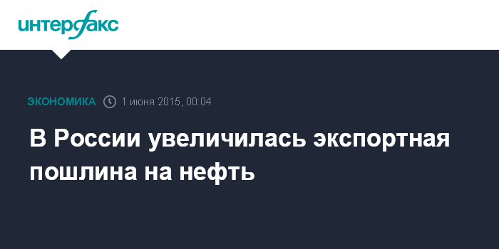 Москва. 1 июня. INTERFAX.RU - Экспортная пошлина на нефть в РФ, согласно данным Минэкономразвития, с 1 июня повышается на $27,9 - до $144,4 за тонну.