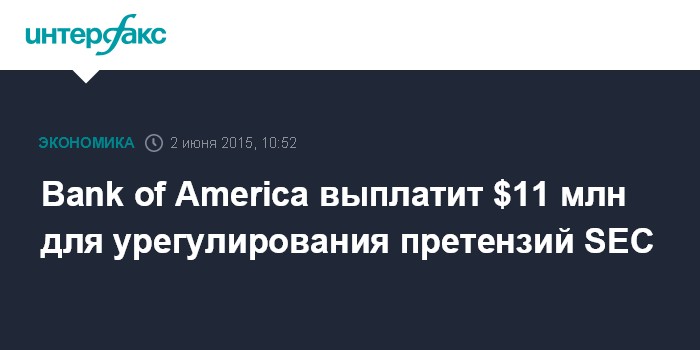 Москва. 2 июня. INTERFAX.RU – Bank of America выплатит почти $11 млн для урегулирования претензий Комиссии по ценным бумагам и биржам (SEC), связанных с использованием в его брокерском подразделении Merrill Lynch неверных данных для исполнения отдельных приказов при "коротких" продажах, сообщает агентство Bloomberg.