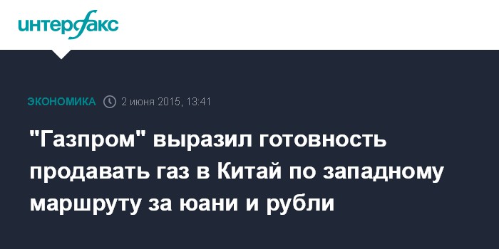 Москва. 2 июня. INTERFAX.RU – "Газпром" готов вести расчеты с китайской стороной при поставках газа в Китай по "западному" маршруту в национальных валютах двух стран.