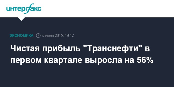 Москва. 5 июня. INTERFAX.RU – Чистая прибыль "Транснефти" в первом квартале 2015 года по МСФО выросла на 56% - до 63,388 млрд рублей, следует из отчета компании. Выручка выросла на 7% - до 201,477 млрд рублей.