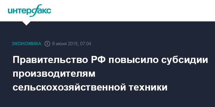 Москва. 9 июня. INTERFAX.RU - Премьер-министр РФ Дмитрий Медведев подписал постановление, согласно которому для производителей сельхозтехники повышаются субсидии. Об этом сообщается на сайте правительства РФ.