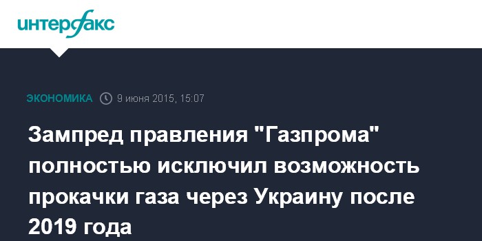 Москва. 9 июня. INTERFAX.RU - "Газпром" не намерен после 2019 года продолжать отношения с Украиной как с транзитером российского газа, заявил журналистам зампред правления "Газпрома" Александр Медведев.