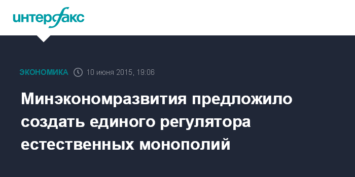 "Что касается модели функционирования органов регулирования естественных монополий и повышения их ответственности, считаем целесообразным рассмотреть возможность создания единого регулятора. В этом случае регуляторные функции в отношении инфраструктурных отраслей могут быть выведены из-под компетенции отраслевых министерств и соответствующих служб (ФАС России и ФСТ России - ИФ) и переданы вышеуказанному регулятору", - озвучил предложения Минэкономразвития источник.