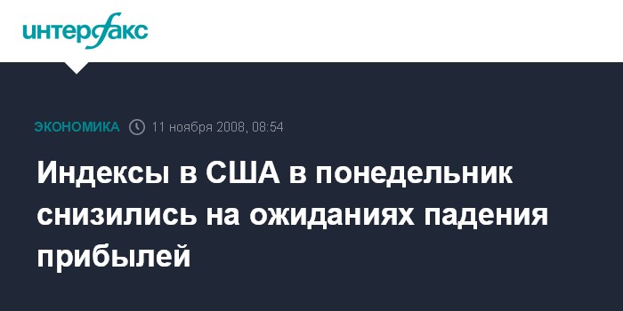 Москва. 11 ноября. INTERFAX.RU - Американские фондовые индексы к концу торговой сессии в понедельник потеряли 0,8-1,9% из-за ухудшения прогноза прибылей компаний и банков, что нивелировало положительный эффект от заявления правительства КНР, сообщило агентство Bloomberg.