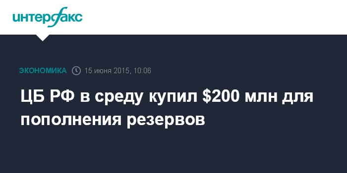 Москва. 15 июня. INTERFAX.RU – ЦБ РФ в среду, 10 июня, купил $200 млн для пополнения резервов, свидетельствует информация на сайте регулятора.