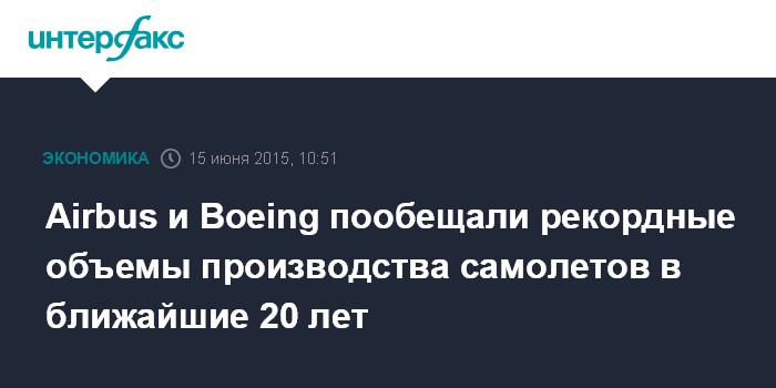 Москва. 15 июня. INTERFAX.RU – Airbus улучшит прогноз поставок своих самолетов на ближайшие 20 лет вслед за своим американским конкурентом Boeing, заявил главный исполнительный директор европейской компании Фабрис на симпозиуме в Ле Бурже.