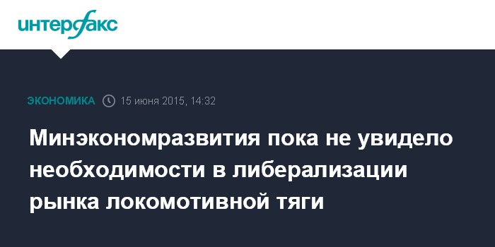 Москва. 15 июня. INTERFAX.RU – Минэкономразвития выступает за централизованную закупку локомотивов РЖД и пока не видит необходимости в присутствии частных локомотивов на ж/д сети.