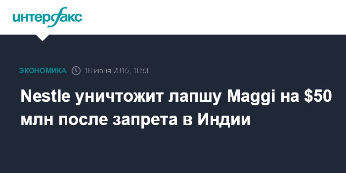 Москва. 16 июня. INTERFAX.RU - Швейцарский производитель продуктов питания Nestle намерен уничтожить запасы лапши под брендом Maggi стоимостью более $50 млн после запрета, введенного на этот продукт индийскими властями, передает BBC News.