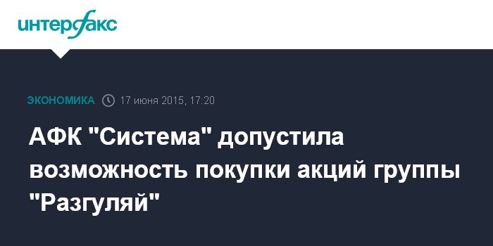 Москва. 17 июня. INTERFAX.RU – АФК "Система" не исключает приобретения акций группы "Разгуляй", сообщил основной владелец АФК Владимир Евтушенков журналистам в среду в Петербурге.