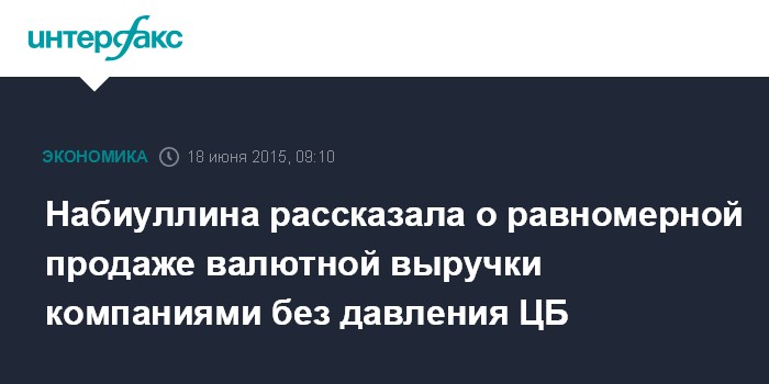 Москва. 18 июня. INTERFAX.RU - Российские компании сейчас достаточно равномерно продают валютную выручку без всякого давления со стороны ЦБ РФ и правительства, заявила глава Банка России Эльвира Набиуллина в интервью телеканалу CNBC.
