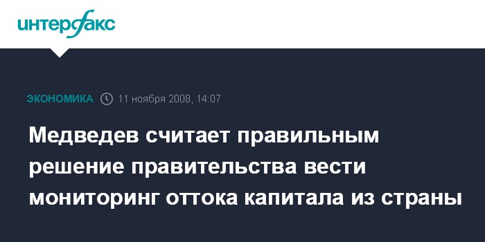 Москва. 11 ноября. INTERFAX.RU - Президент РФ Дмитрий Медведев считает правильным решение правительства вести мониторинг оттока капитала из страны.
