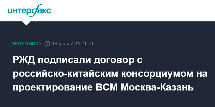 Москва. 18 июня. INTERFAX.RU – РЖД и российско-китайский консорциум в рамках Петербургского международного экономического форума подписали договор на проектирование высокоскоростной железнодорожной магистрали (ВСМ) Москва-Казань.