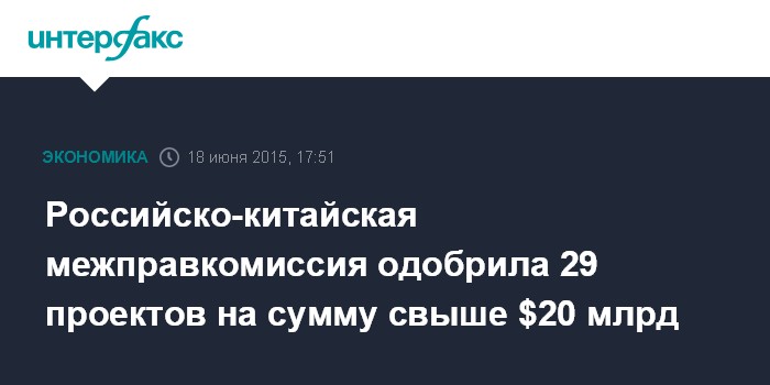 "В рамках комиссии Шувалов-Чжан Гаоли одобрены новые 29 проектов на сумму свыше $20 млрд. Общее число проектов комиссии - 58. Проекты в таких областях, как строительство высокоскоростных железнодорожных магистралей, производство промышленного оборудования, инновационных материалов, строительных материалов, автомобилей, добывающая отрасль и металлургия, химическая промышленность, сельское хозяйство, лесная отрасль", - сообщил замминистра экономического развития Станислав Воскресенский журналистам.