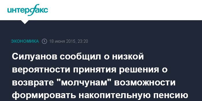 Москва. 18 июня. INTERFAX.RU - Автоматический переход "молчунов" в накопительную пенсию вряд ли будет возвращен, считает министр финансов РФ Антон Силуанов.