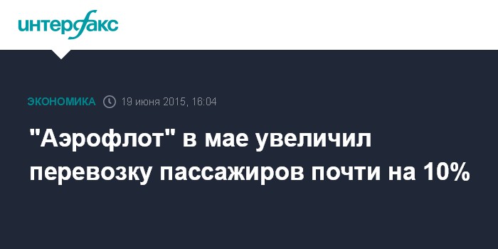 Москва. 19 июня. INTERFAX.RU – "Аэрофлот " в мае 2015 года увеличил перевозку пассажиров на 9,9% по сравнению с тем же месяцем 2014 года, до 2,128 млн человек, говорится в сообщении компании