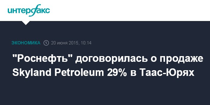 Москва. 20 июня. INTERFAX.RU - "Роснефть" договорилась о продаже Skyland Petroleum 29% в ООО "Таас-Юрях Нефтегазодобыча", говорится в сообщении российской компании.