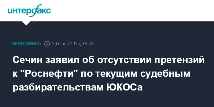 Сечин заявил об отсутствии претензий к "Роснефти" по текущим судебным разбирательствам ЮКОСа