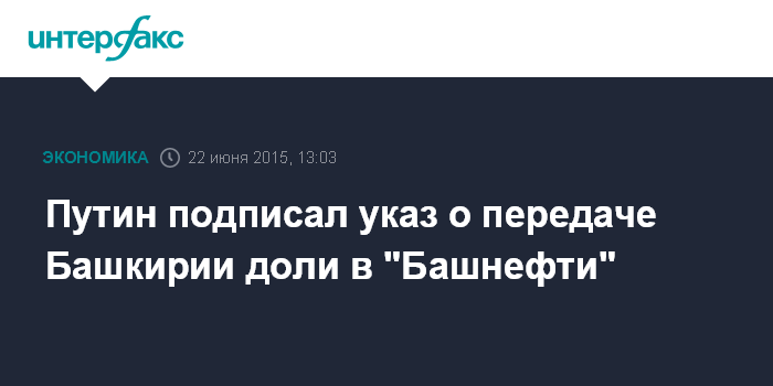 Москва. 22 июня. INTERFAX.RU – Президент Владимир Путин подписал указ о передаче в собственность Башкирии 25% плюс одна акция нефтяной компании "Башнефть", говорится на официальном портале раскрытия информации. Указ был подписан 21 июня и вступает в силу с момента подписания.