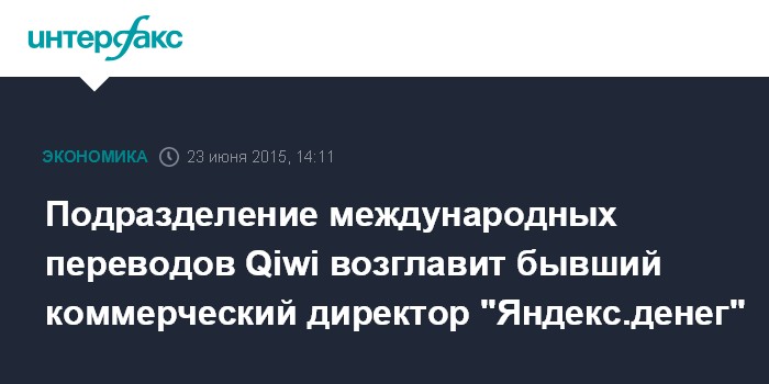 Москва. 23 июня. INTERFAX.RU – Руководителем подразделения международных переводов Qiwi с 6 июля будет назначен бывший коммерческий директор "Яндекс.денег" Дмитрий Даниленко, говорится в сообщении Qiwi.
