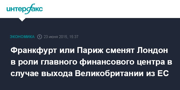 Москва. 23 июня. INTERFAX.RU – Если Великобритания примет решение выйти из состава Европейского союза, новыми финансовыми центрами Европы могут стать Париж или Франкфурт, полагают аналитики Standard & Poor's.