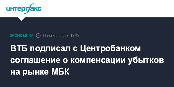 Минск. 11 ноября. INTERFAX.RU - ВТБ подписал с ЦБ РФ соглашение о компенсации убытков на рынке МБК, сообщил председатель правления ВТБ Андрей Костин в ходе видеоконференции с представителями дочерних банков в Армении, Белоруссии и на Украине.