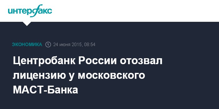 Москва. 24 июня. INTERFAX.RU - Центральный банк России отозвал лицензию на осуществление банковских операций у МАСТ-Банка (Москва), говорится в сообщении Центробанка.