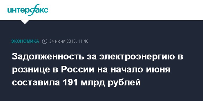 Задолженность за электроэнергию в рознице в России на начало июня составила 191 млрд рублей