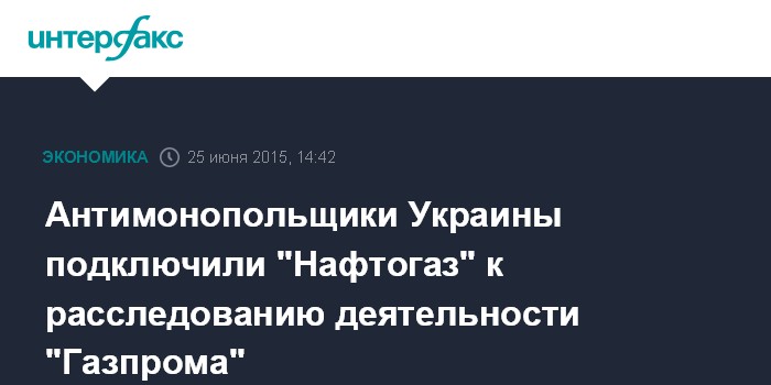 Москва. 25 июня. INTERFAX.RU - Антимонопольный комитет Украины (АМКУ) ведет расследование деятельности российской компании "Газпром" и для этого проводит консультации с НАК "Нафтогаз Украины".