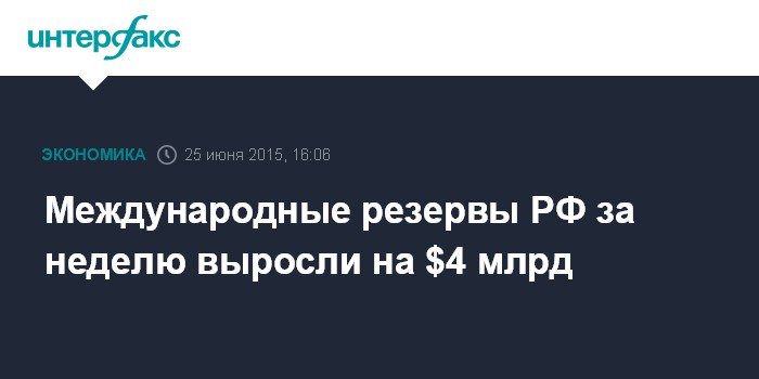 Москва. 25 июня. INTERFAX.RU – Международные резервы России на 19 июня составили $364,6 млрд, сообщил Банк России. По состоянию на 12 июня международные резервы равнялись $360,6 млрд. Таким образом, за неделю они увеличились на $4 млрд.