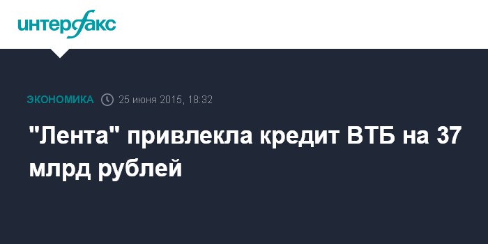 Москва. 25 июня. INTERFAX.RU - Ритейлер "Лента" подписал соглашения с банком ВТБ о привлечении 7-летнего необеспеченного кредита в размере 37,3 млрд рублей.