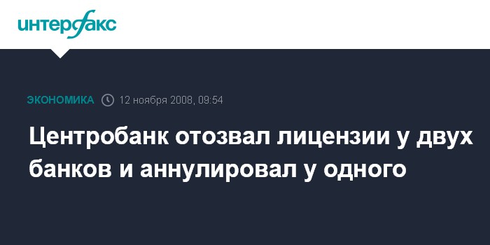 Москва. 12 ноября. INTERFAX.RU - Банк России с 12 ноября отозвал лицензии на осуществление банковских операций у Эконацбанка (Москва) и Мира-банка (Москва), говорится в сообщении департамента внешних и общественных связей ЦБ РФ.