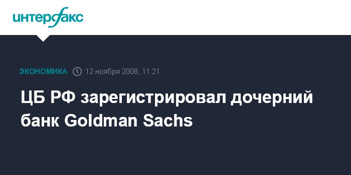 Москва. 12 ноября. INTERFAX.RU - Банк России зарегистрировал "дочку" американского банка Goldman Sachs - ООО "Голдман Сакс Банк". Об этом говорится на сайте ЦБ.