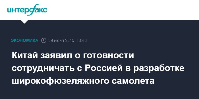 Китай заявил о готовности сотрудничать с Россией в разработке широкофюзеляжного самолета
