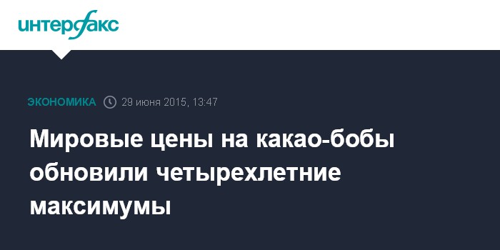 Москва. 29 июня. INTERFAX.RU - – Мировые цены на какао-бобы обновили четырехлетние максимумы: цены фьючерсов на какао-бобы с поставкой в июле на Лондонской товарной бирже в пятницу, 26 июня, обновили очередной максимум в 2 172 фунта за тонну, цены на какао-бобы на бирже в Нью-Йорке установились на уровне $3 328 за тонну.