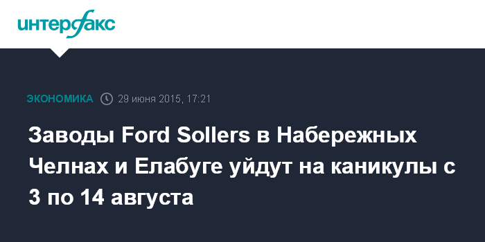 Москва. 29 июня. INTERFAX.RU – Заводы СП американского автопроизводителя Ford и российской компании "Соллерс" с 3 по 14 августа остановят конвейеры на период летних коллективных отпусков.