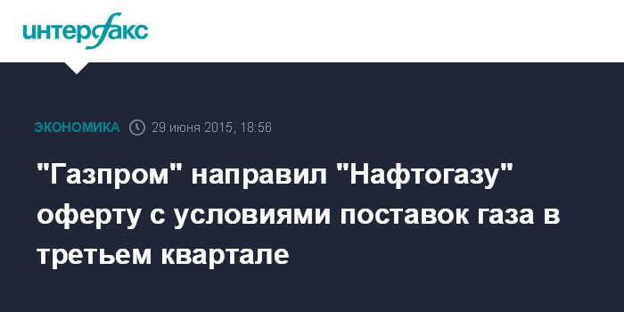 Москва. 29 июня. INTERFAX.RU - "Газпром"в понедельник направил в НАК "Нафтогаз Украины" оферту о подписании дополнения к действующему контракту купли-продажи природного газа в 2009-2019 годах.