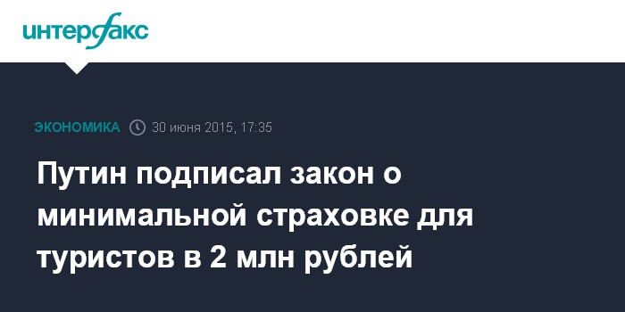 Москва. 30 июня. INTERFAX.RU - Президент РФ Владимир Путин подписал закон, который фиксирует минимальную страховую сумму по полисам выезжающих за рубеж на уровне 2 млн рублей, сообщает во вторник официальный сайт Кремля.
